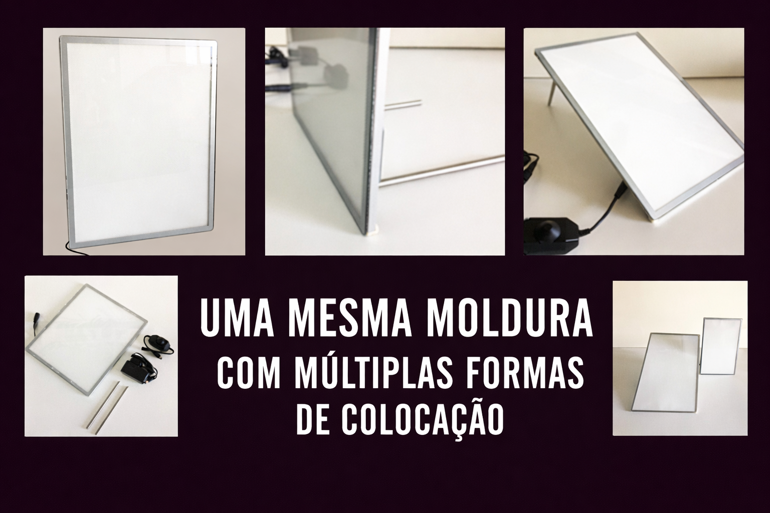 A moldura iluminada ultrafina (1 cm) é uma placa iluminada muito versátil para exibir pósteres, permitindo alterar facilmente a imagem interna sempre que desejar.